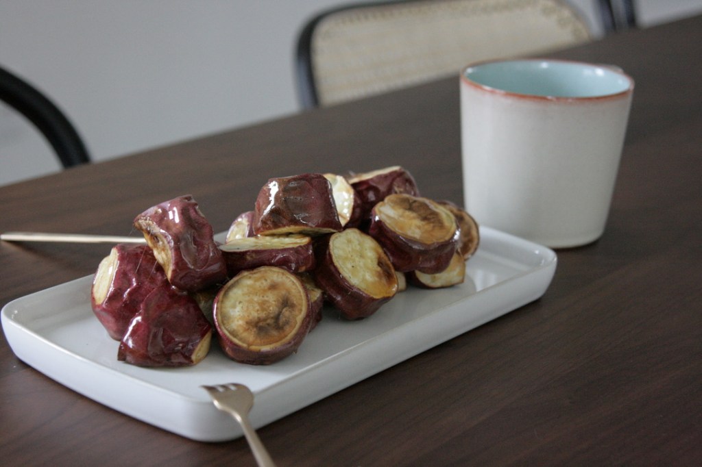 Baked sweet potatoes with a cup of hot tea are always my favorites for the quick breakfast and the simple snacking. I like their own naturally sweet and savory flavors. Then, one day, I remembered one of my favorite childhood sweet treats, Candied Sweet Potatoes (고구마 맛탕), which is traditionally deep-fried, covered dissolved sugar in oil. I was afraid of its huge amount of oil, so I did little tweaks to the recipe to make the snack lighter and healthy-ish.