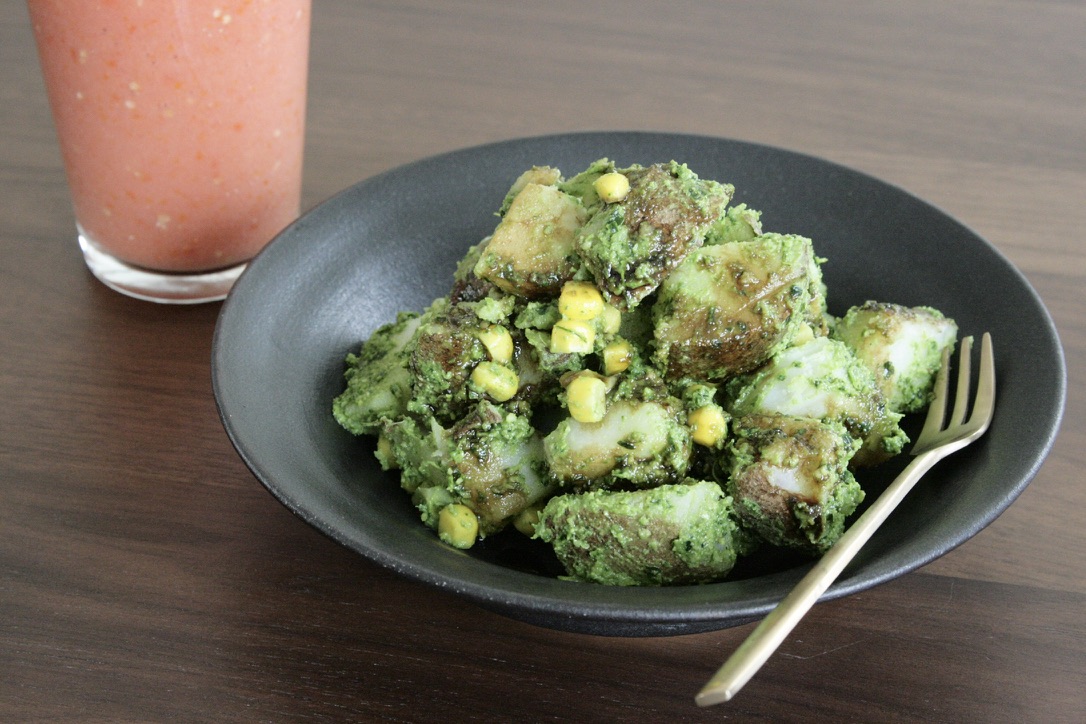 With my creamy and savory pesto, I’ve had a lot of fun with veggies and fruits together, which is the best part of this pesto. By having healthy and delicious meals every day, I feel that my gut is much happier than ever!